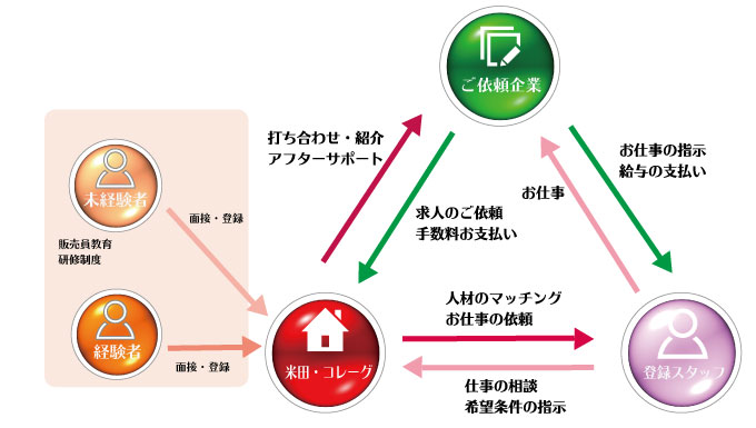 米田コレーグでは、はじめてお仕事に行って頂くスタッフの皆様すべてにおきまして、百貨店における全てのノウハウを一からお教えし、安心して一歩目を踏み出していただける様に研修を行って下ります。